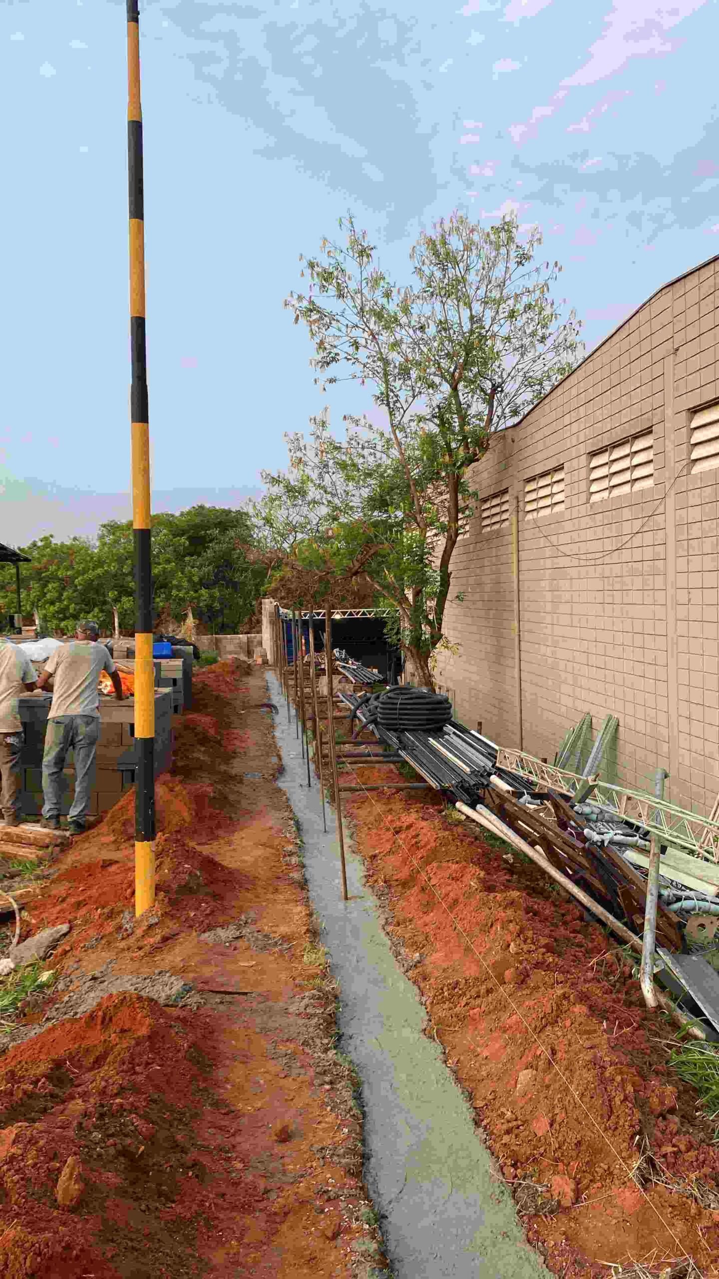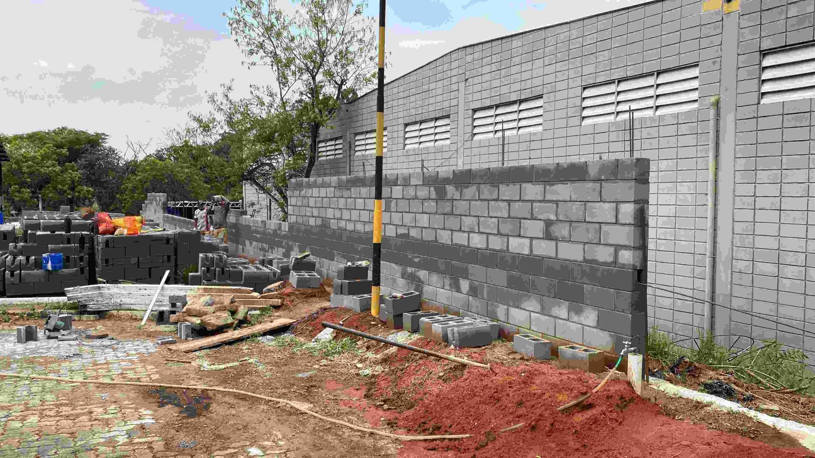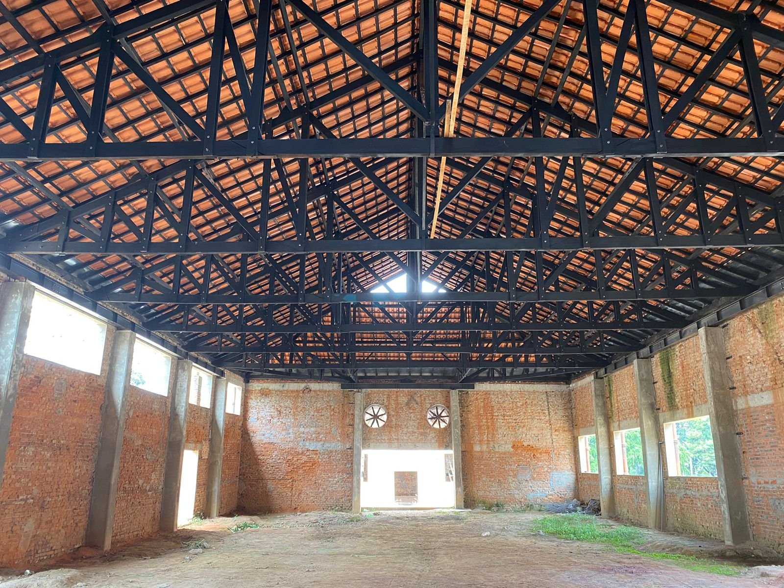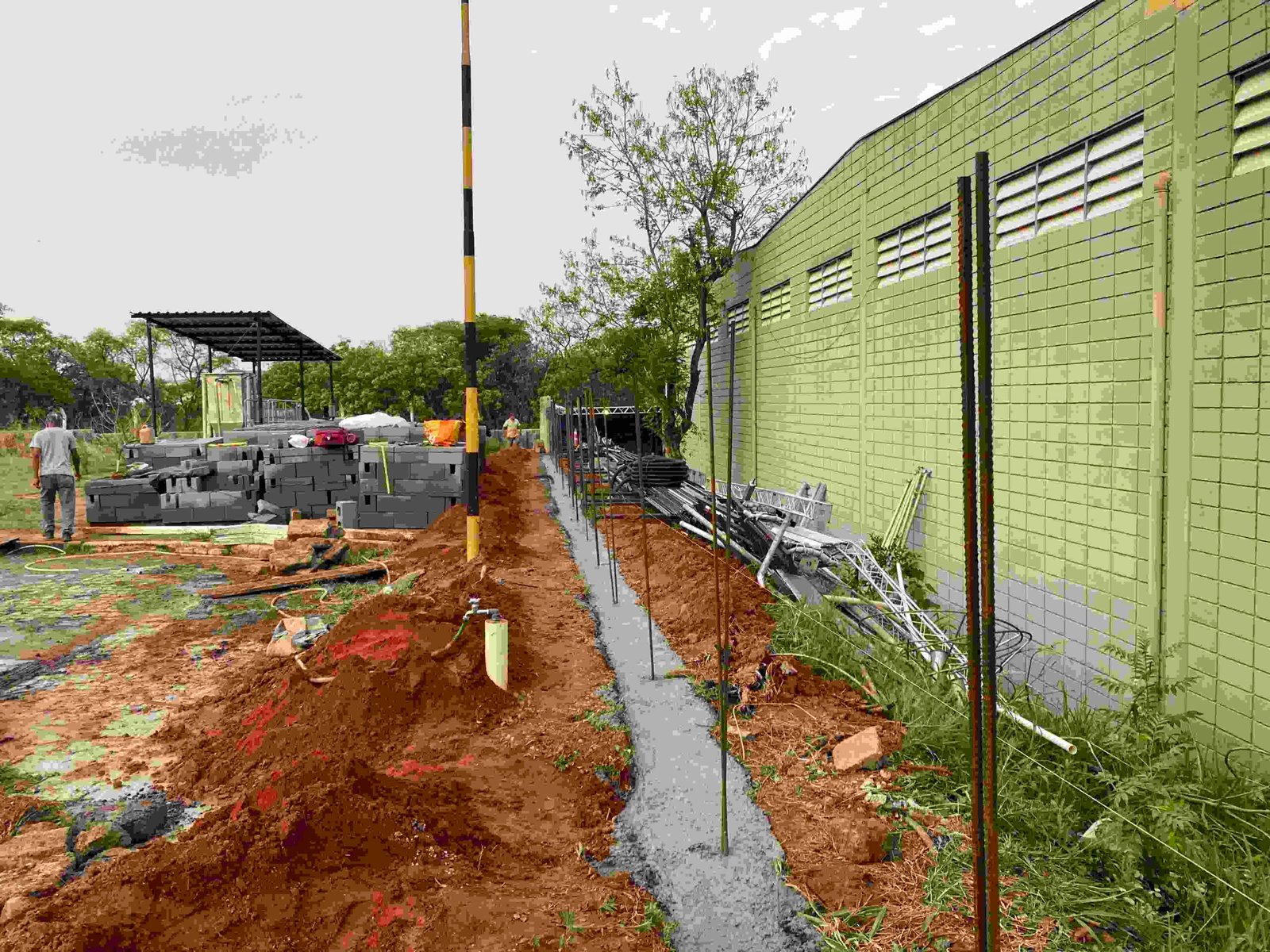 Executamos o muro de divisa e a cobertura em estrutura de madeira com telhas cerâmicas no galpão, entregando um trabalho sólido e bem acabado para o dia a dia da operação.