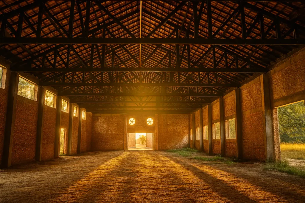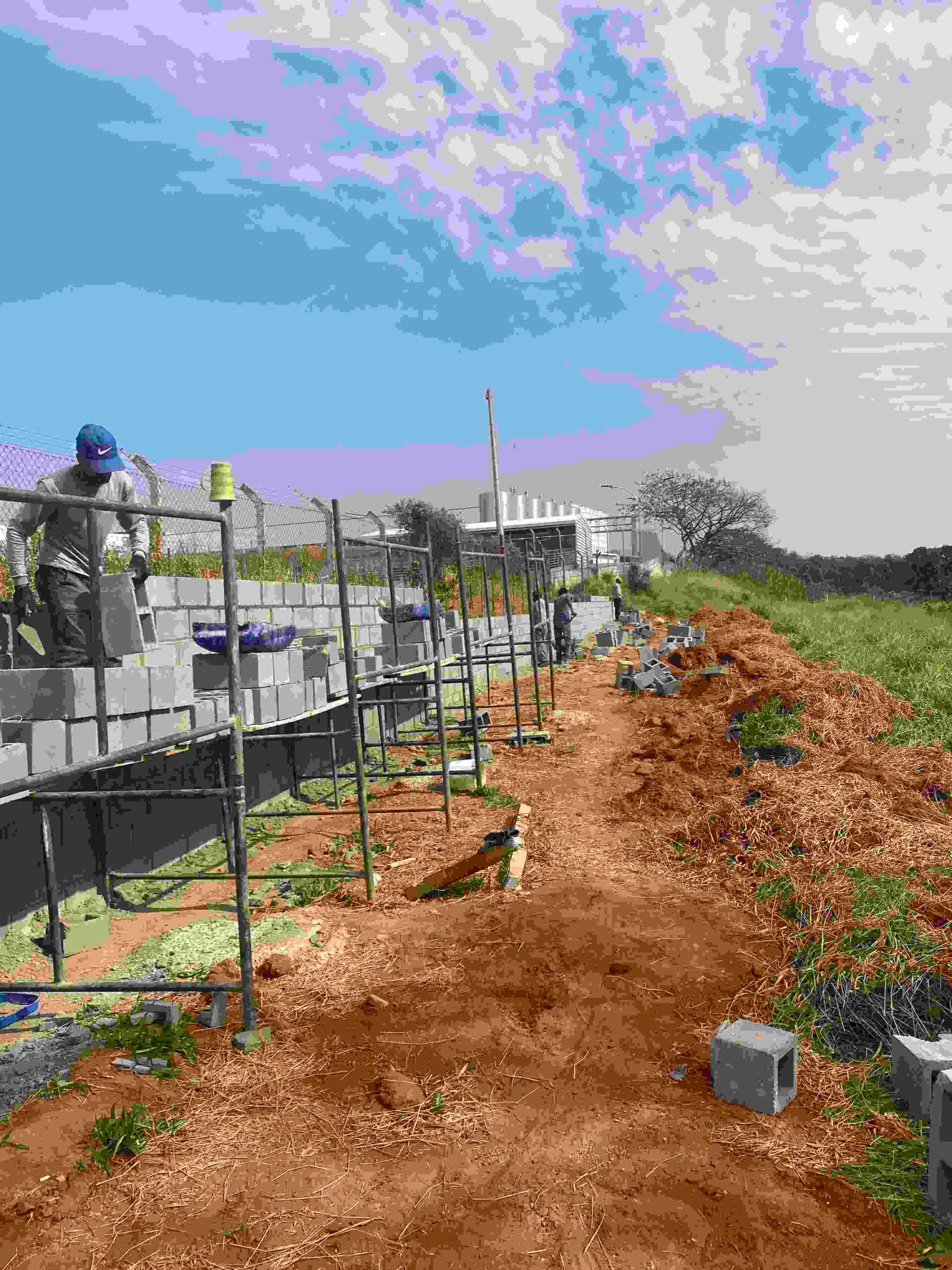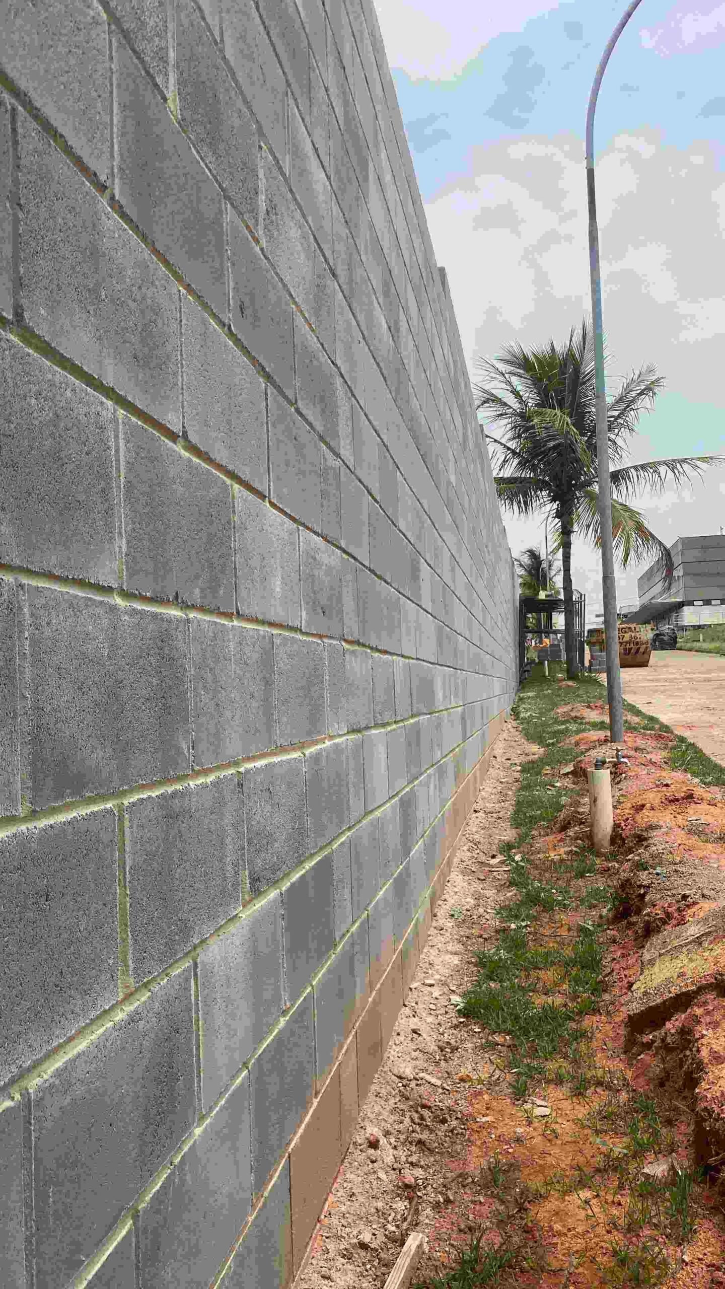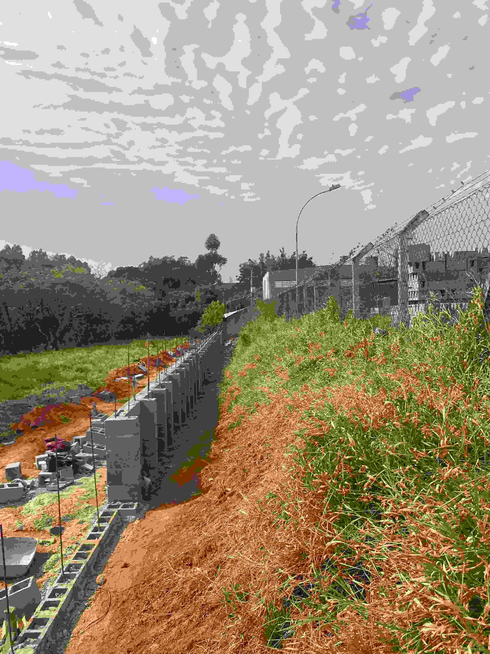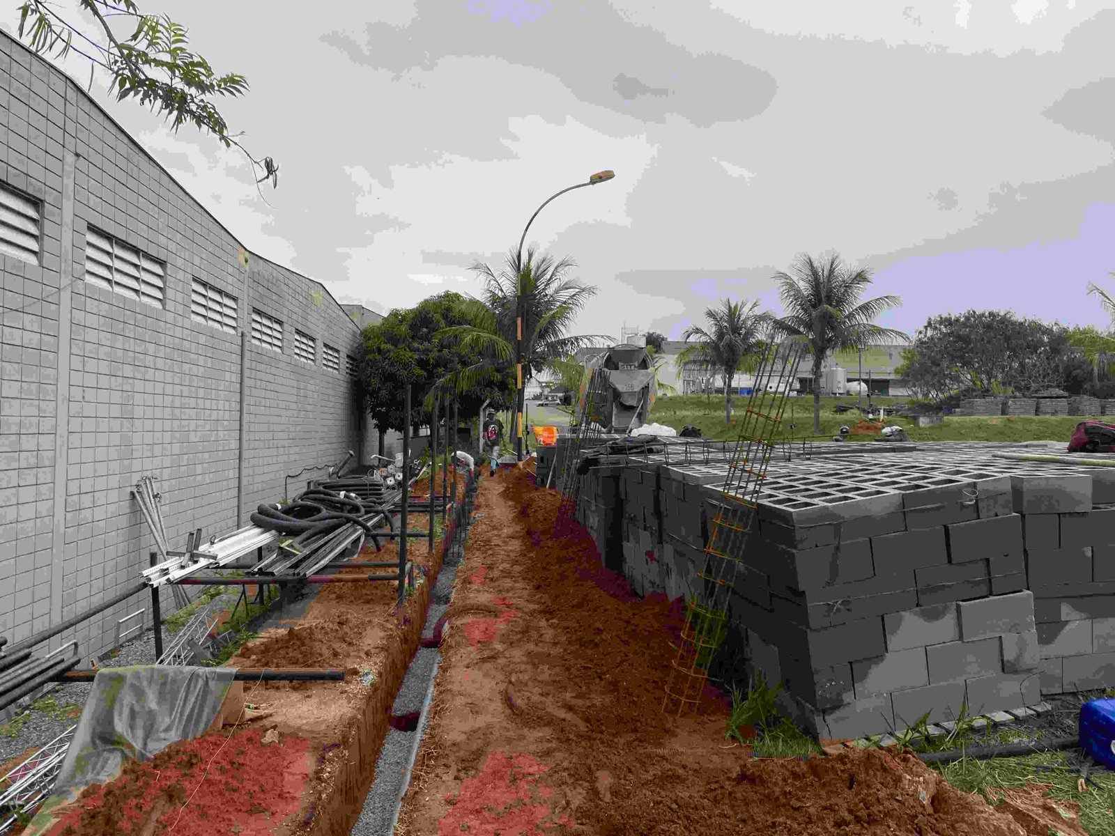 Executamos o muro de divisa e a cobertura em estrutura de madeira com telhas cerâmicas no galpão, entregando um trabalho sólido e bem acabado para o dia a dia da operação.